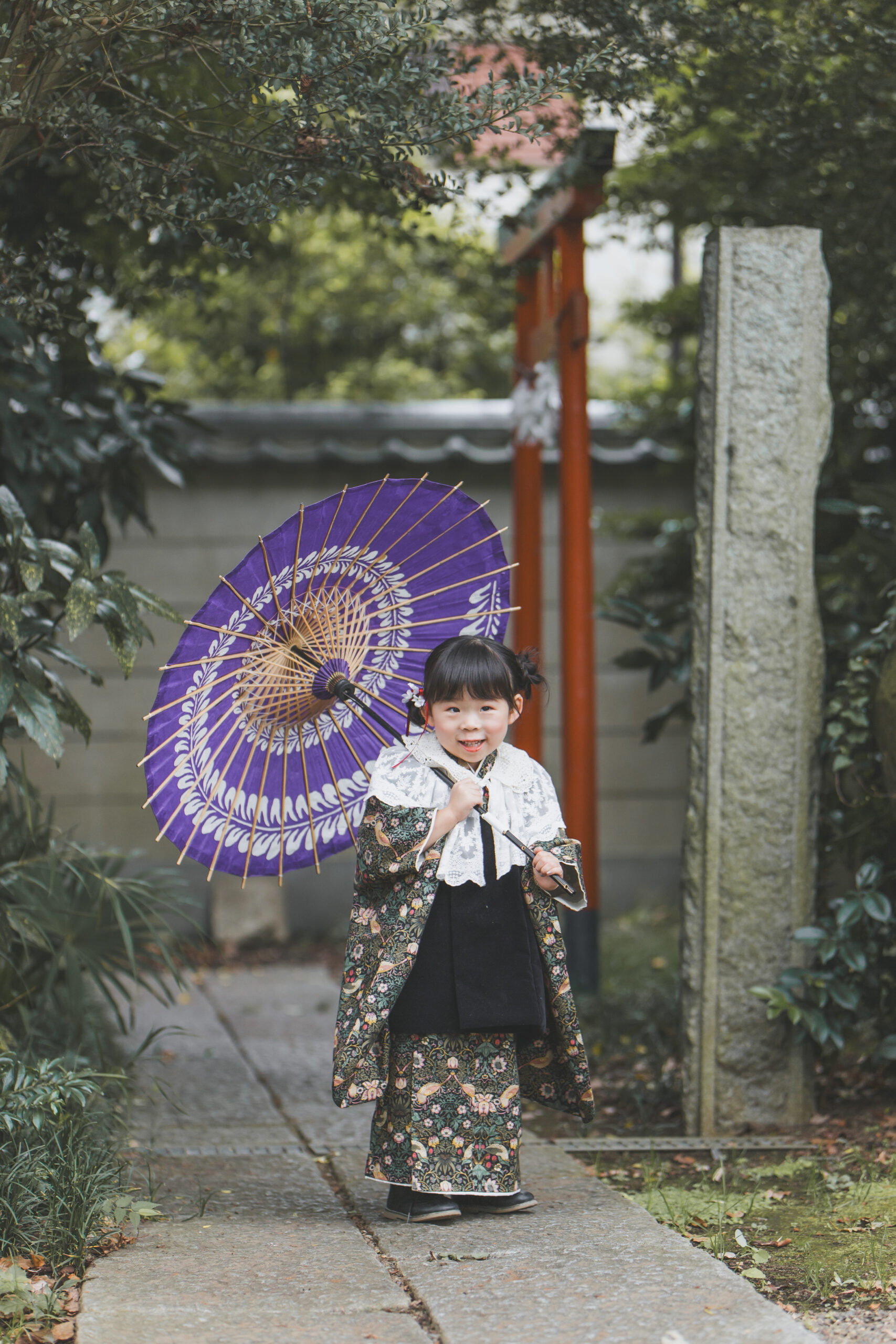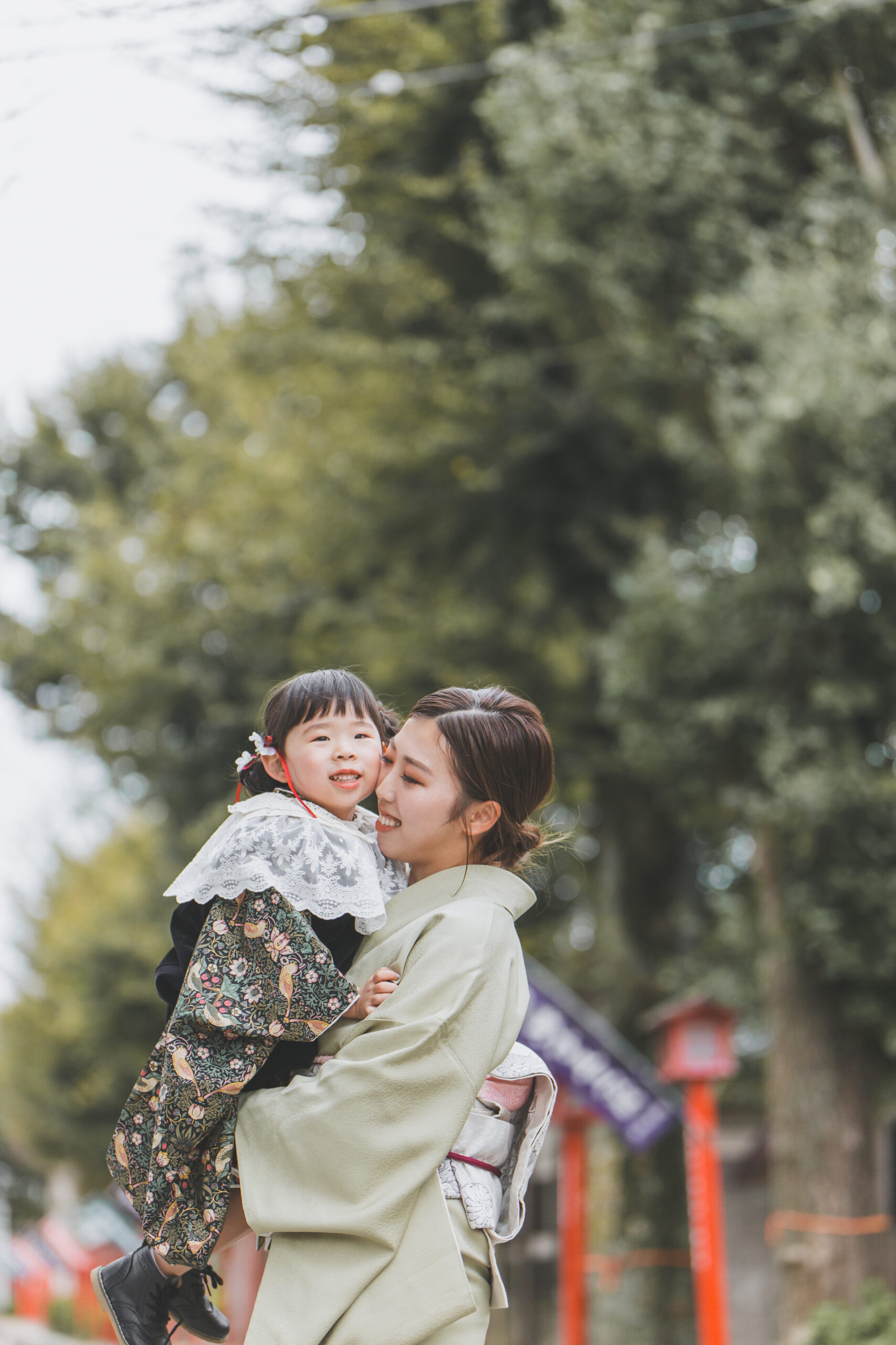 神社での撮影は、自然の光と季節の色が背景になるのが魅力。