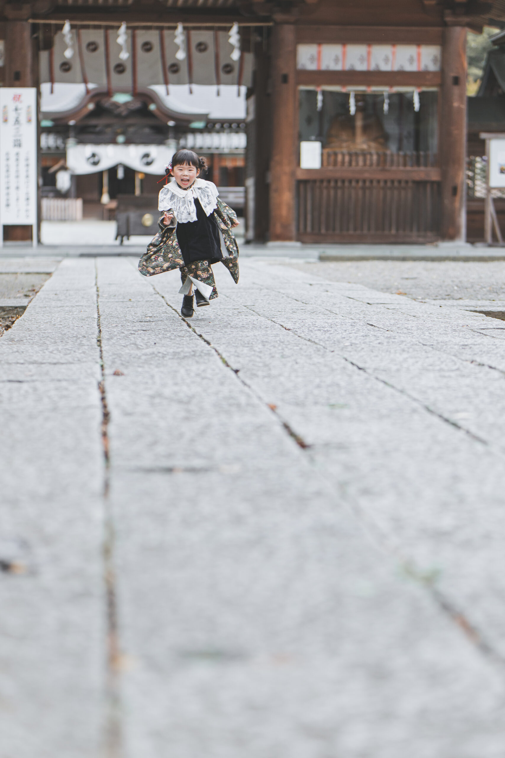 撮影が始まると、すぐに神社の境内を走り出す元気な姿。