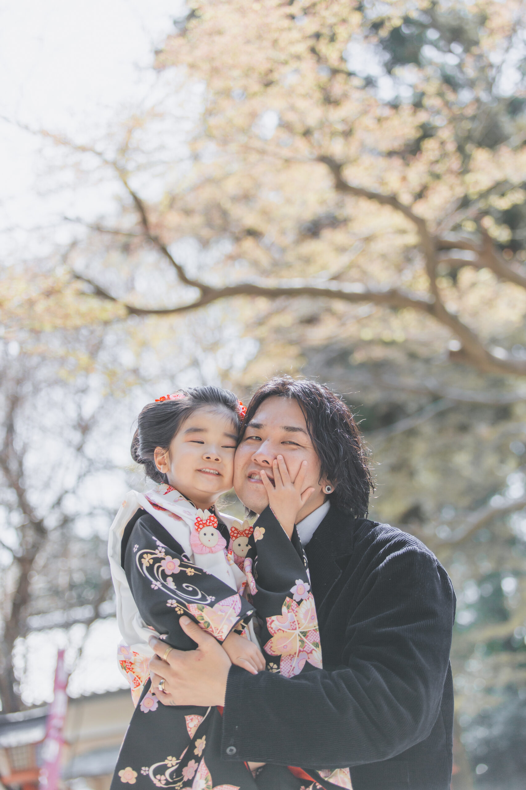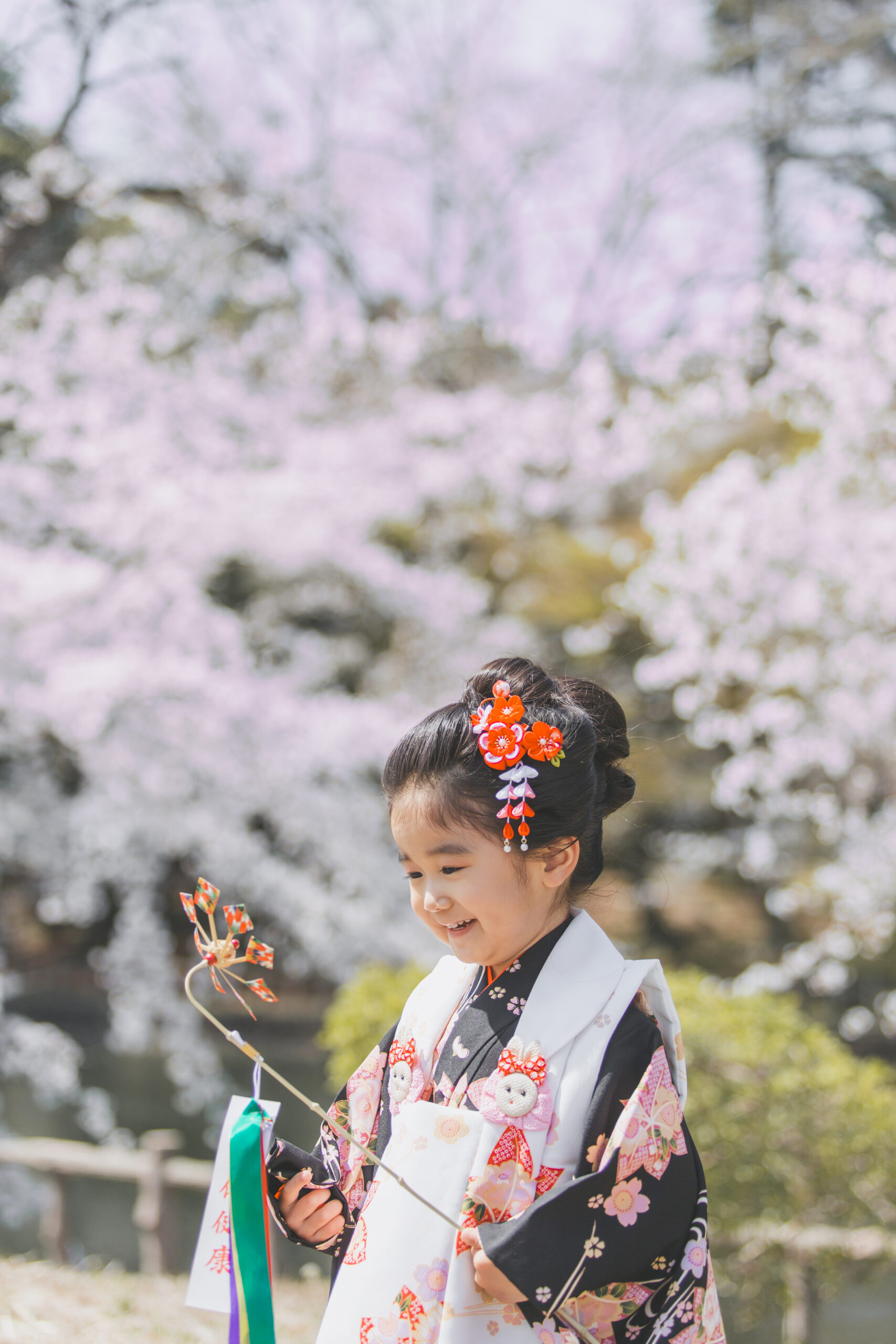 満開の桜の中での七五三写真は、